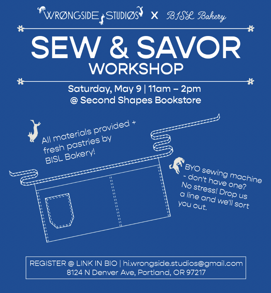 Three hours of beginner-friendly sewing instruction - threading, straight stitching, and everything in between. You'll leave with an adorable Sidecar Pocket and a pastry filled belly.